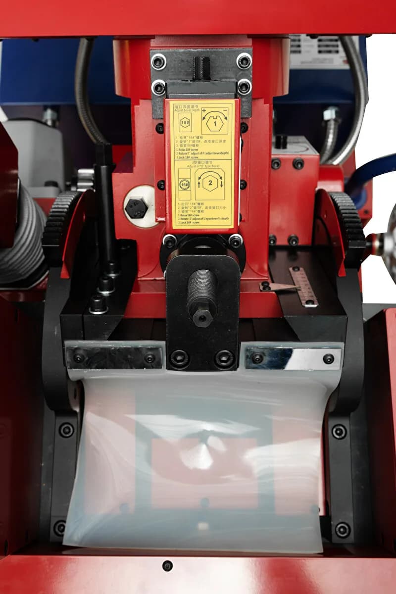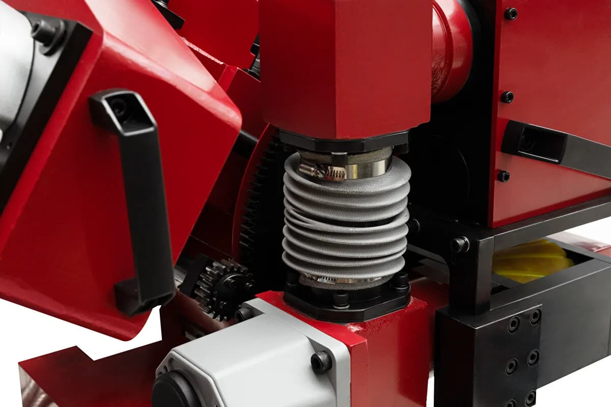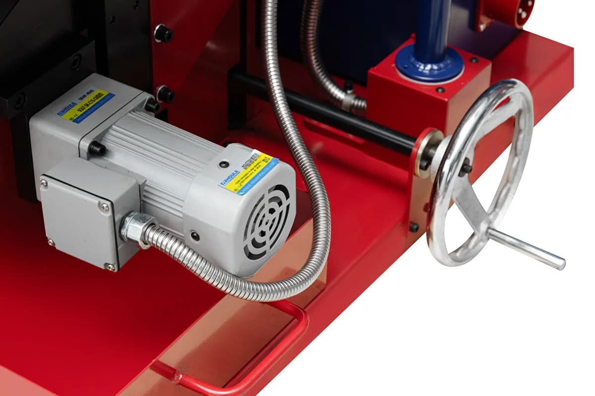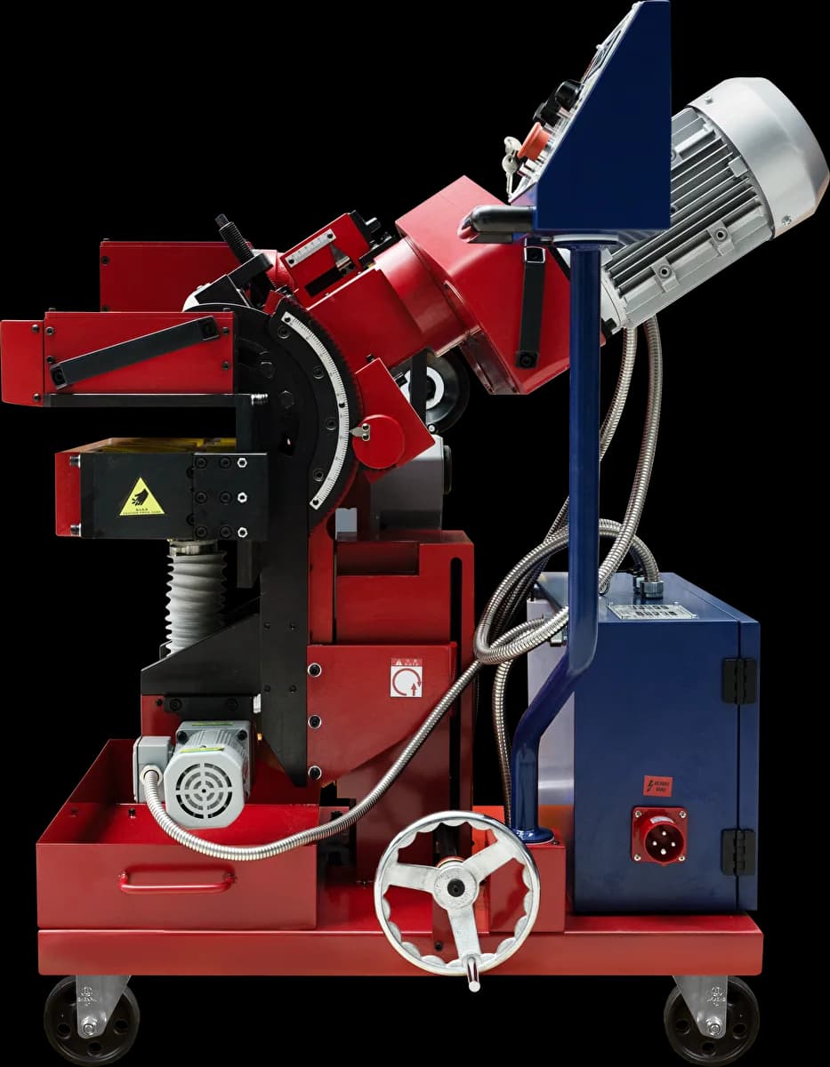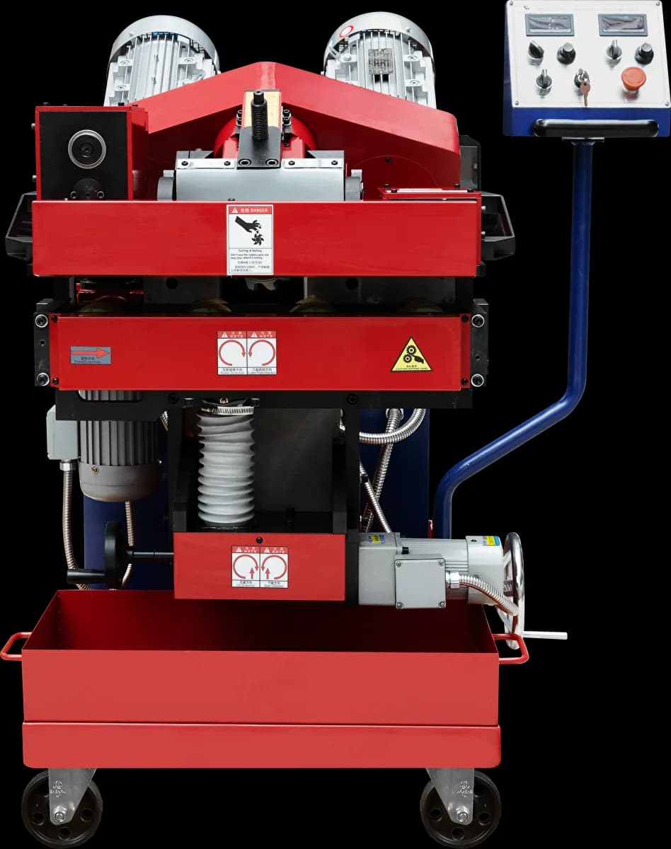 Кромкорез HM-100L с автоматической подачей предназначен для снятия фаски с кромки листового металла из нержавеющей и углеродистой стали, меди и алюминиевых сплавов. Станок крепится на заготовку за счет зажимных опорных роликов, расположенных cнизу рабочего узла машины перед фрезой.