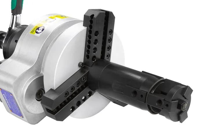 Крепится трубный торцеватель за счет трехкулачкового распорного вала на внутренней части трубы. Благодаря новой, переработанной системе крепления фиксация внутри трубы осуществляется максимально жестко и надежно. На новом держателе (голове) могут быть установлены одновременно до трех резцов, что позволяет выполнять операции по снятию внешней фаски, торцовке и обработке внутренней кромки одновременно. Подача осуществляется вручную, что позволяет обрабатывать кромку плавно и равномерно.