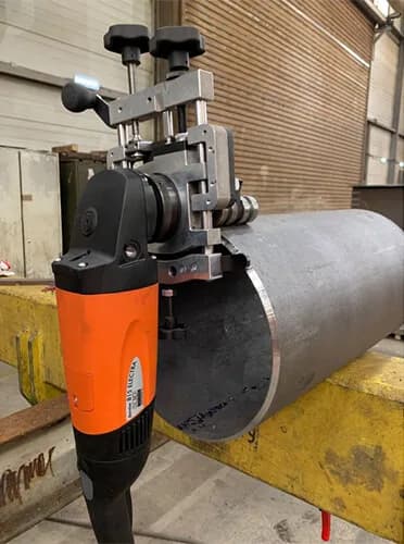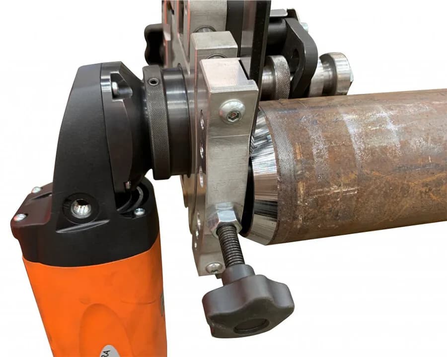 - Благодаря гибкому креплению направляющих роликов, приспособление справляется с любыми неровностями и неточностями по окружности трубы.